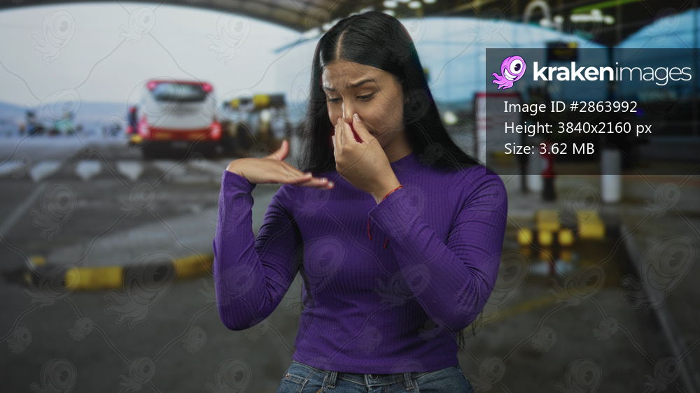 Woman pinches nose with one hand and raises other palm in front of mouth at outdoor airport terminal; disgust.