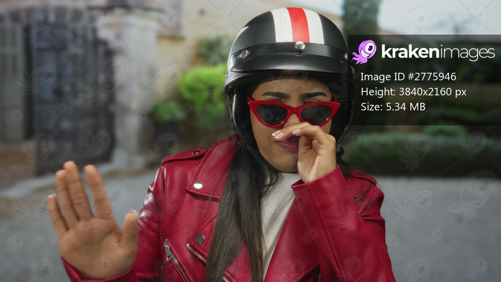 Woman pinches nose while covering face outdoors as young latin hispanic rider in helmet on a motorbike reacts to a foul odor.