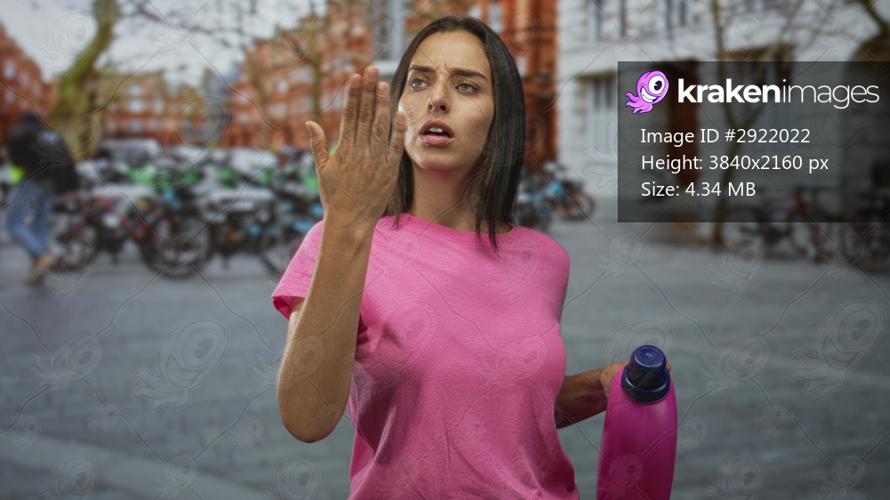 Woman pinches nose while holding pink detergent bottle on a city street with bicycles and brick building visible; odor concern disgust.
