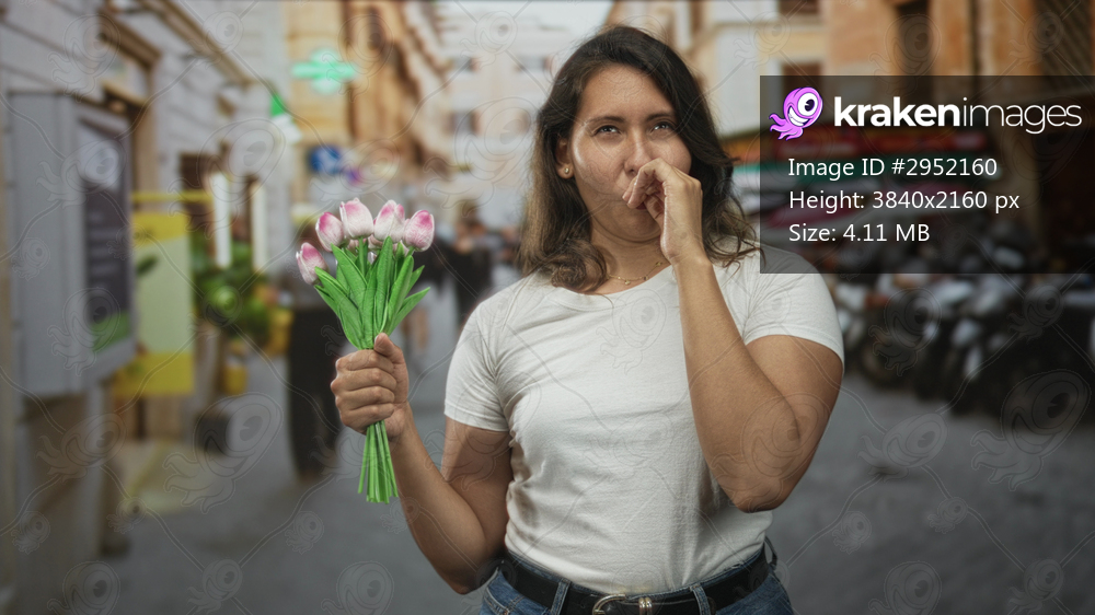 Woman pinches nose while holding pink tulips on a busy city street with a pained expression; disgust.