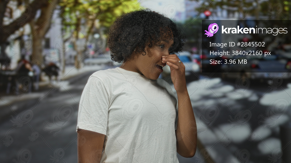 Woman pinches nose while walking along a sunlit busy city street lined with trees and parked cars; disgust.