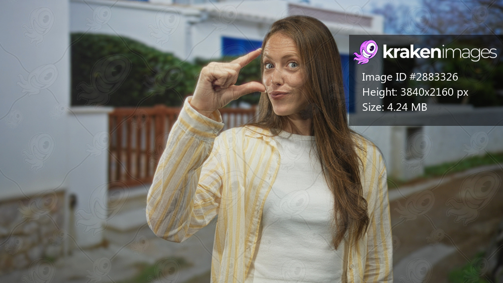 Woman pinches thumb and forefinger near face to show small size on street in front of building; playful tease.