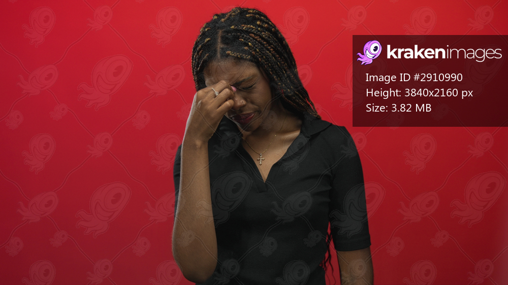 Woman pinching bridge of nose with hand in studio against red backdrop wearing black shirt and cross necklace; discomfort.