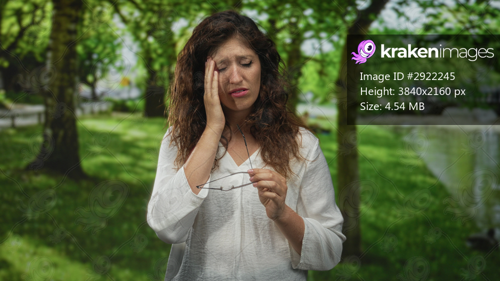 Woman pinching bridge of nose while holding reading glasses in green park near pond and trees wearing white blouse; headache.