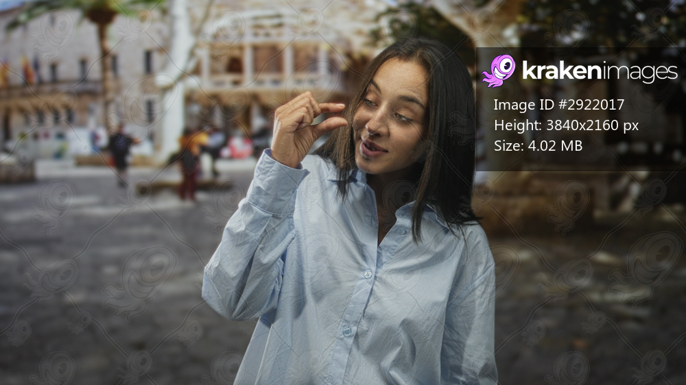 Woman pinching fingers near eye to show small size on street with visible hand and smile; playful tease.