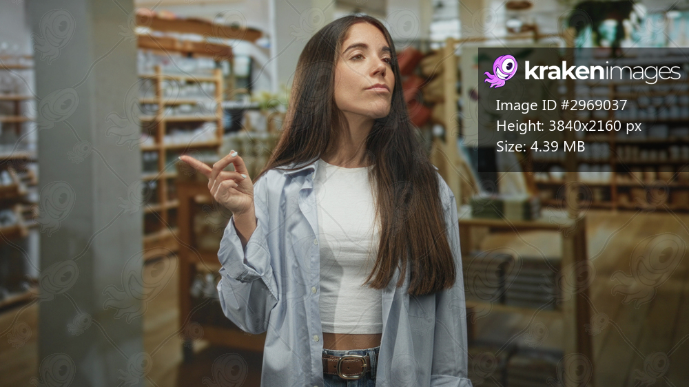 Woman pinching fingers near face with closed eyes inside a retail building lined with shelves of jars and books; serenity.