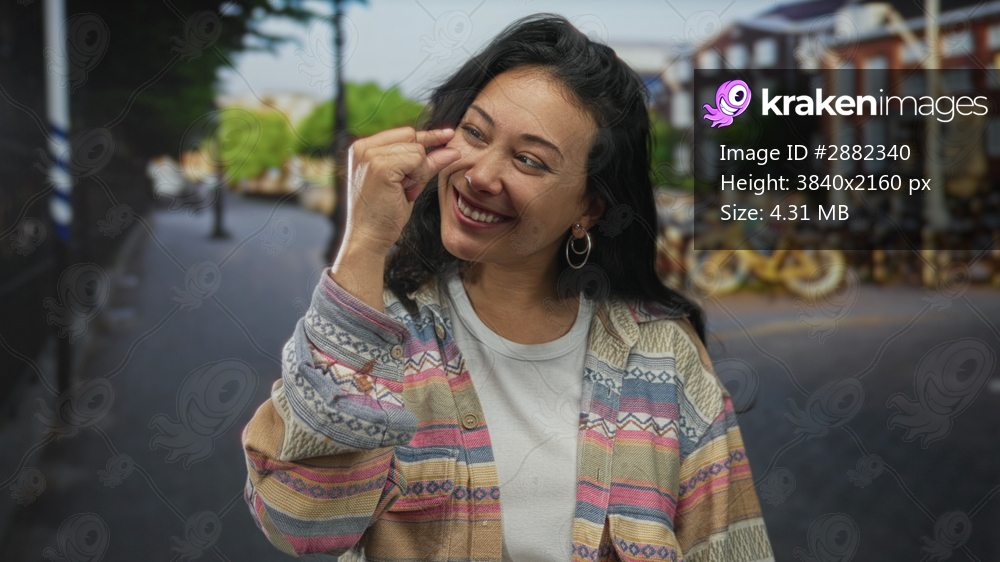 Woman pinching fingers near nose on street while squinting and smiling at camera, wearing patterned jacket; playful teasing.
