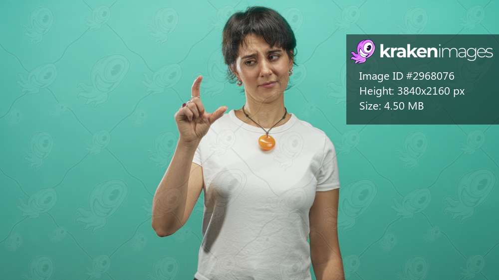 Woman pinching fingers to indicate small size while wearing orange pendant in studio; skepticism measurement.