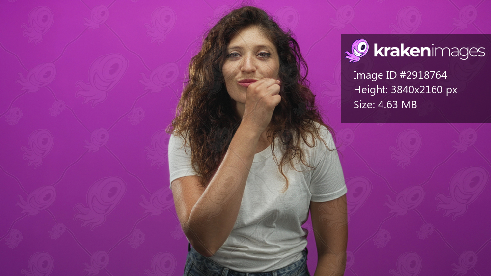 Woman pinching fingers to lips in studio with vibrant purple backdrop, looking at camera and gesturing a kiss; playful flirtation.