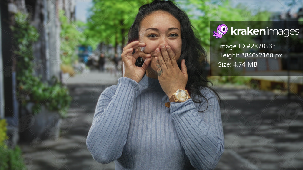 Woman pinching fingers to lips on a city street while smiling and covering mouth with other hand; playful mischief charm.