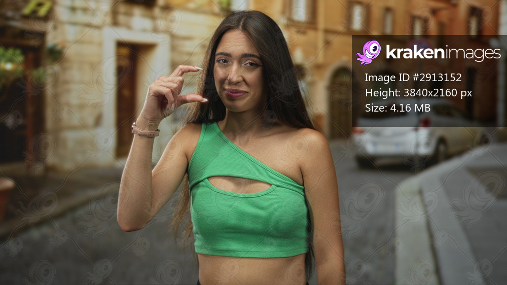 Woman pinching fingers to show tiny size while wearing a green crop top exposing shoulder on a cobbled city street; playful teasing.