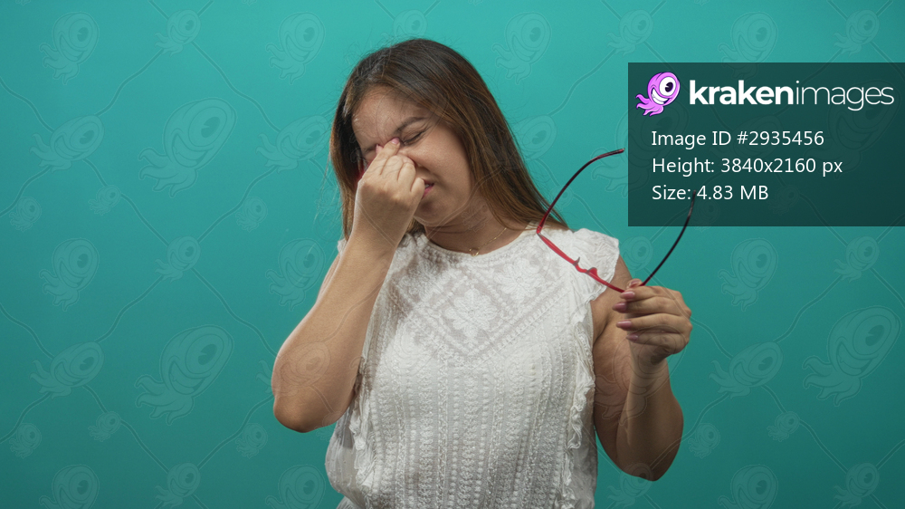 Woman pinching her nose and removing red glasses while wearing a white lace top in studio against a teal backdrop; disgust.