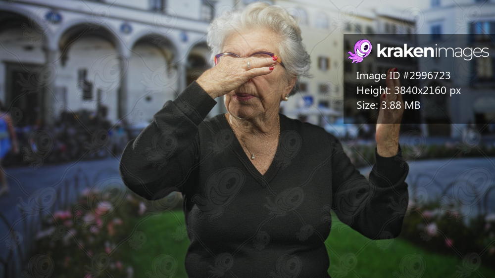 Woman pinching nose and adjusting glasses while standing in a street plaza with buildings and flowerbeds; disgust.