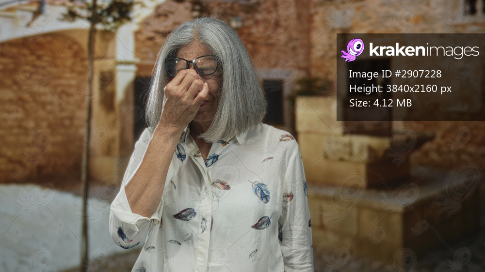 Woman pinching nose with hand in old town street beside stone fountain and building, glasses on face and patterned blouse; discomfort.