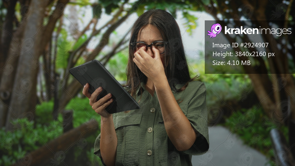 Woman pinching nose and holding tablet on forest path under trees, wearing glasses and green shirt; disgust.