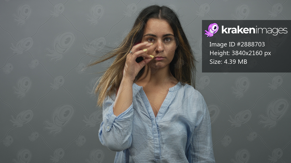 Woman pinching nose and touching cheek with hand showing yellow nails in gray studio wearing loose blue shirt and long hair; disgust dismissal.