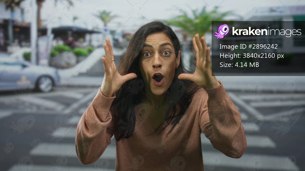 Woman pinching temples and gesturing with open hands on a street crosswalk near palm trees and parked car in an outdoor urban scene; frustration.