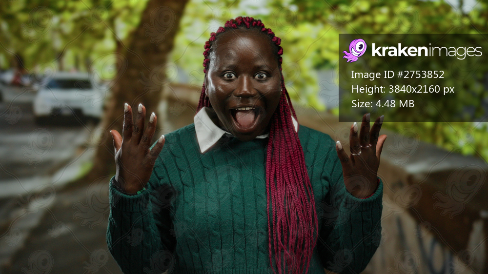 Woman with pink braids expresses surprise in a green sweater while standing in a lush park setting with trees and cars visible.
