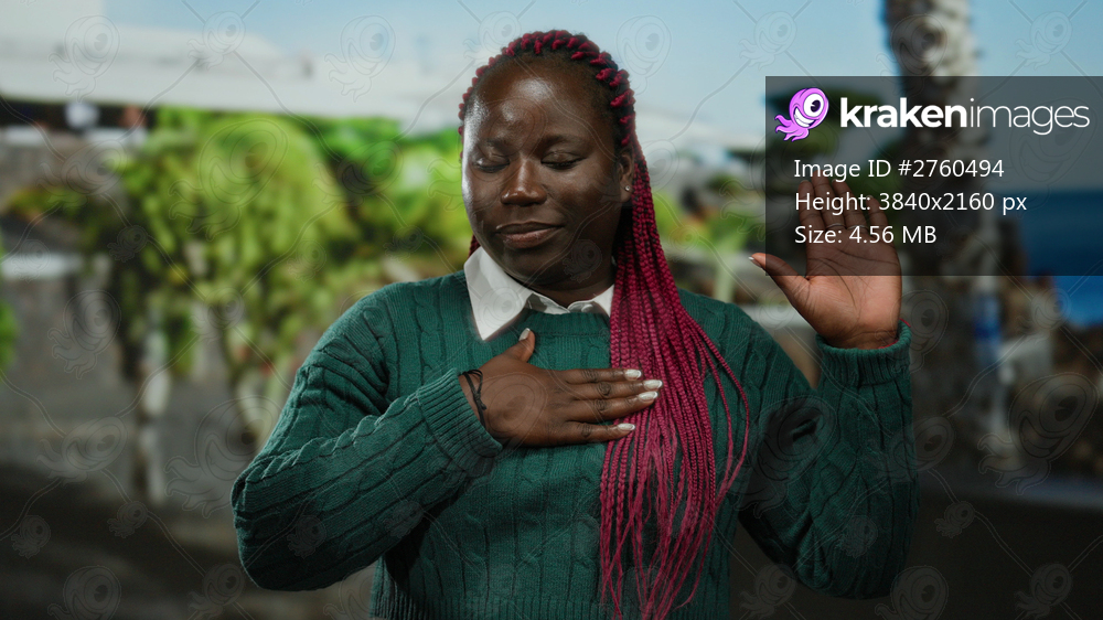 Woman with pink braids making a pledge gesture outdoors in a green sweater against a lush park background capturing a solemn moment emphasizing commitment and sincerity. - Kraken Images