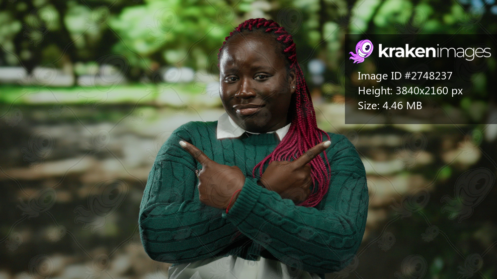 Woman with pink braids wearing green sweater points in opposite directions outdoors in park with blurred trees in background conveying confusion or decision. - Kraken Images