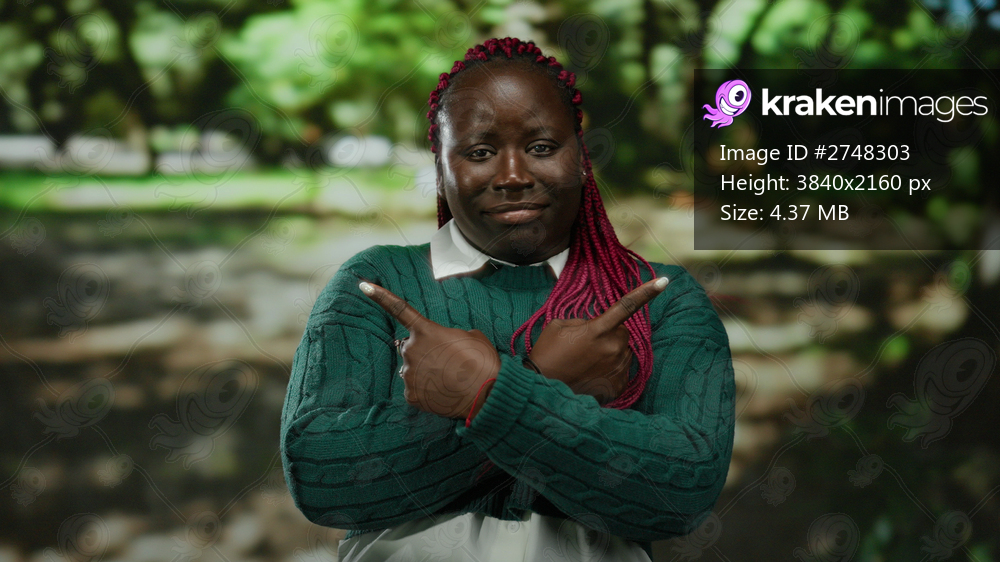 Woman with pink braids wearing green sweater points in opposite directions outdoors in park with blurred trees in background conveying confusion or decision. - Kraken Images