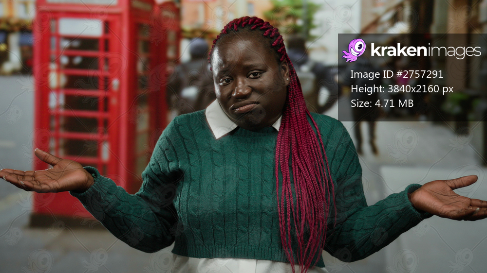 Woman with pink hair in green sweater stands by iconic red phone booth on busy city street expressing confusion.