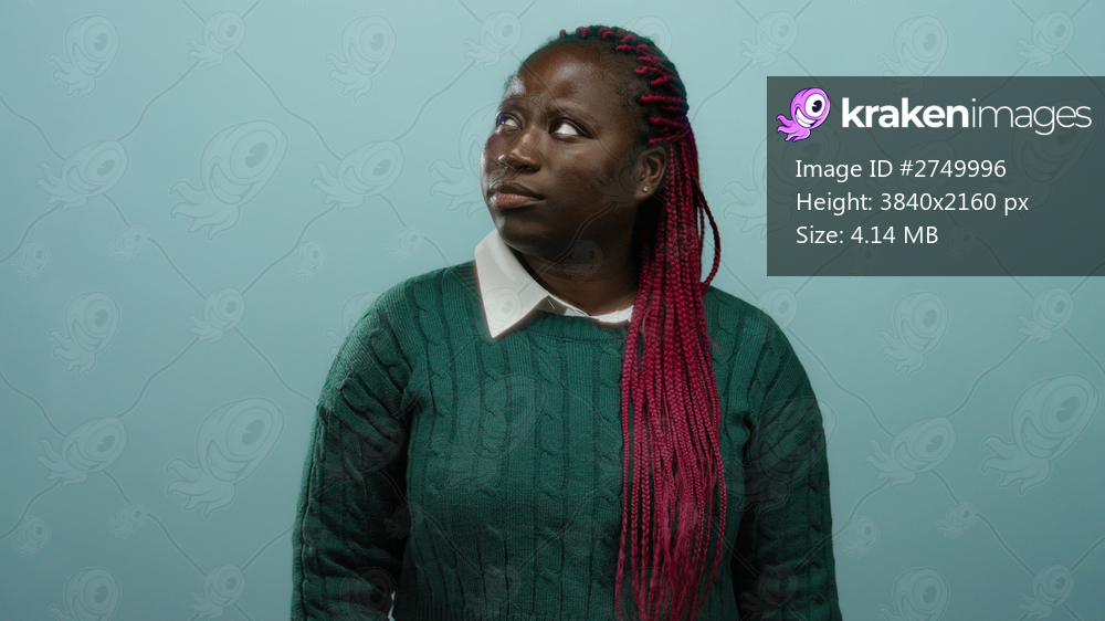 Woman with pink hair standing against an isolated blue background wearing a green sweater, african american, looking thoughtful and curious.