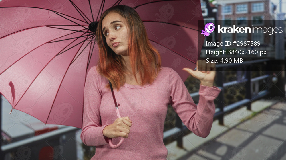 Woman with pink umbrella and red ombre hair pointing thumb to herself by canal railing on city street with brick buildings and wet pavement; resignation. - Kraken Images