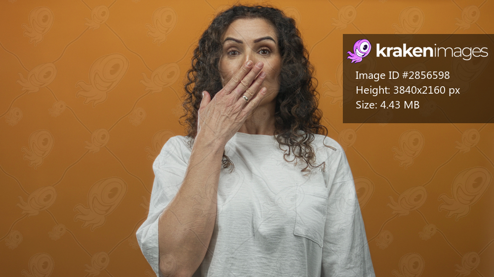 Woman places finger to lips with curious gaze and raised eyebrow in bright orange studio setting; surprise silence.