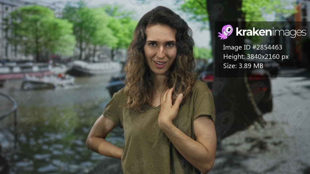 Woman places hand on chest beside canal water on street in amsterdam with moored boats and leafy trees; joy.
