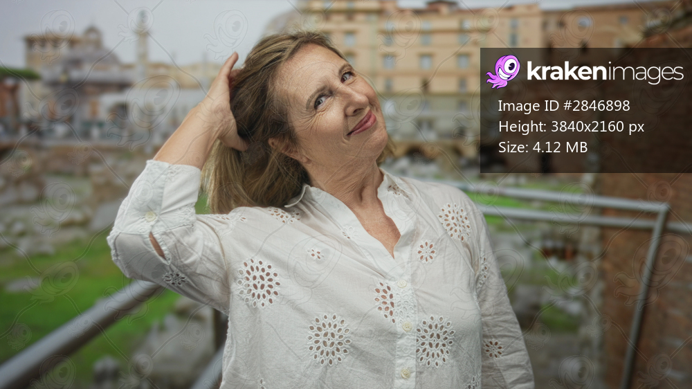 Woman places hand on forehead while standing beside ancient roman ruins building in daylight; contemplation.