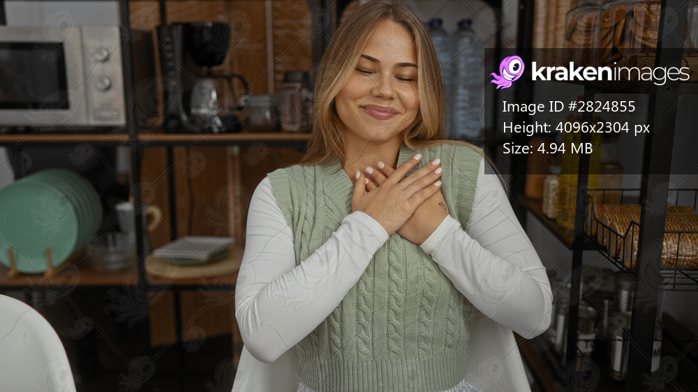 Woman places her hands on her chest in building, smiling with closed eyes and wearing a sweater; gratitude serenity.