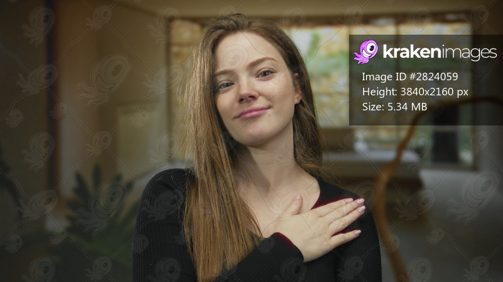 Woman places palm over chest wearing black sweater in building lobby while gazing warmly at camera; gratitude.