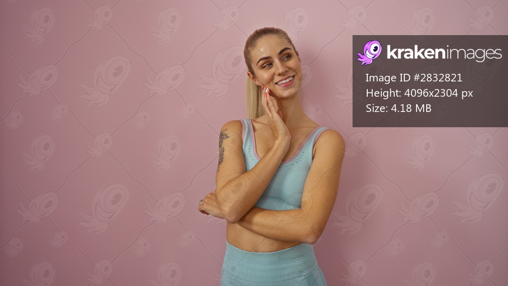 Woman places right hand on cheek with left arm crossed wearing light blue sports bra and leggings in studio setting; confidence.