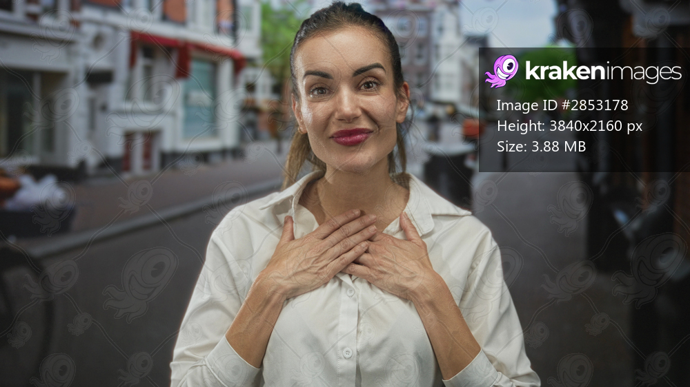Woman placing bare hands on her white shirt front on a busy urban street framed by blurred bicycle and building facades; gratitude.