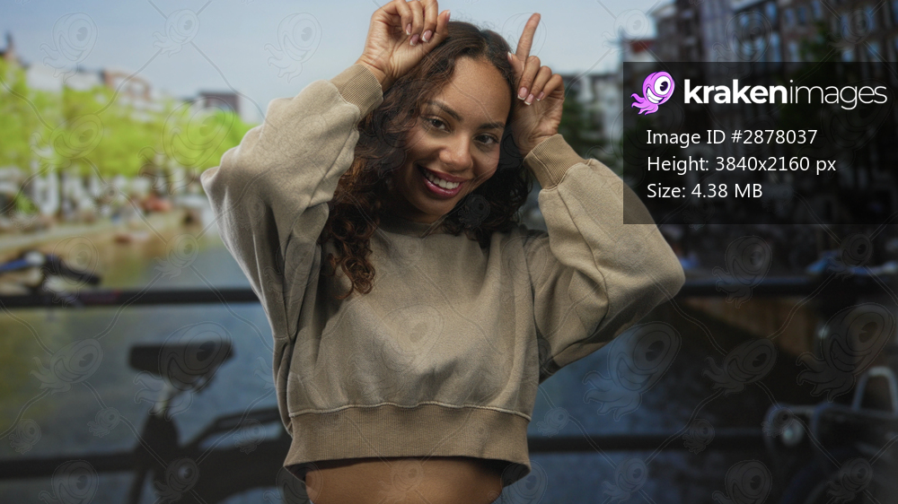 Woman placing fingers to her head in a playful horns gesture on a canal street in amsterdam, smiling and showing casual cropped sweatshirt; playful confidence. - Kraken Images