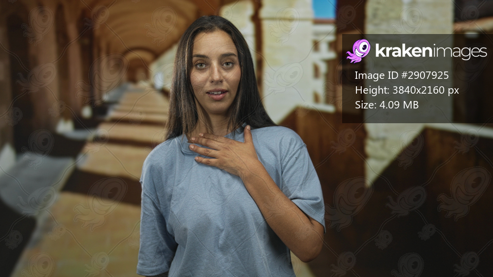 Woman placing hand on chest on old town street, looking toward camera with a gentle expression; contemplation.