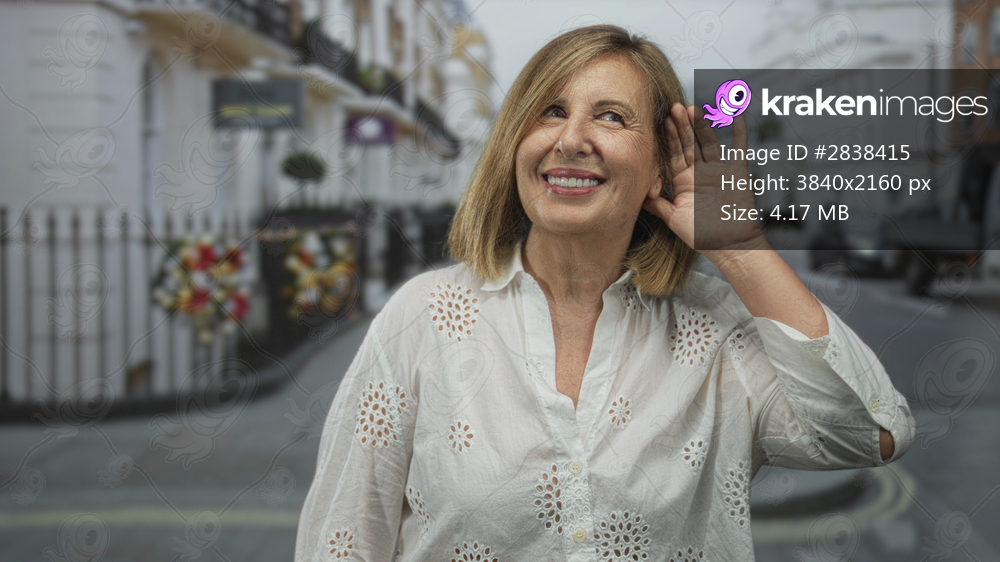 Woman placing hand to ear in a bustling urban street scene while tilting head inquisitively amid traffic and storefronts; curiosity.