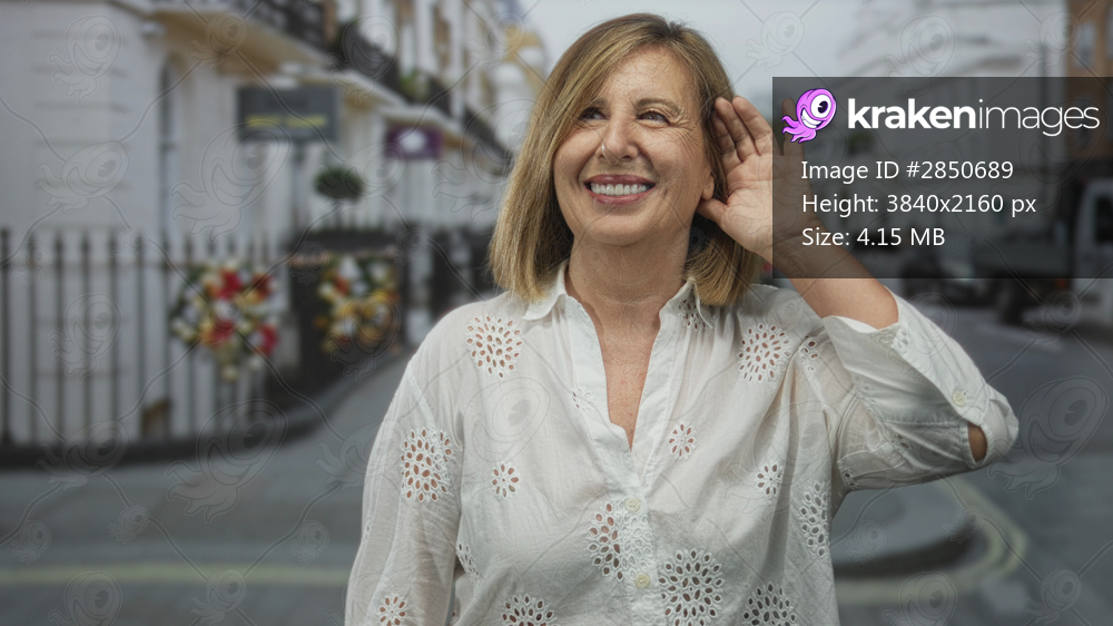 Woman placing hand to ear in a bustling urban street scene while tilting head inquisitively amid traffic and storefronts; curiosity.