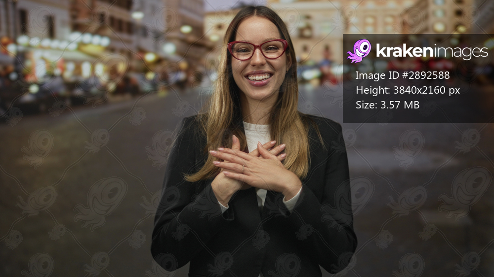 Woman placing hands over chest on cobblestone street at night, smiling with red glasses and black blazer; gratitude warmth.