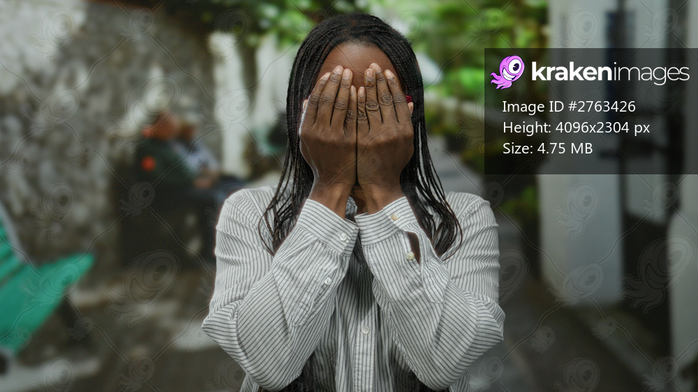 Woman with playful expression stands on city street with hands on face and wearing glasses, showcasing excitement and surprise in urban outdoor setting. - Kraken Images