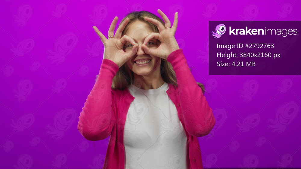 Woman playfully gesturing goggles with hands against a vibrant purple background, exuding happiness and fun in a casual white shirt and pink cardigan
