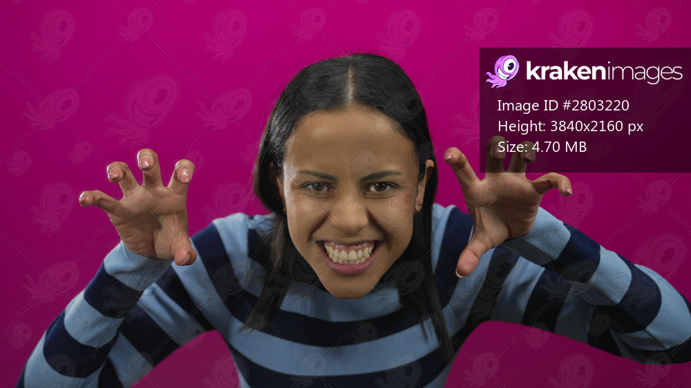 Woman playfully making claw gestures in front of a vibrant pink background wearing a striped sweater and expressing joy with a lively and engaging expression. - Kraken Images