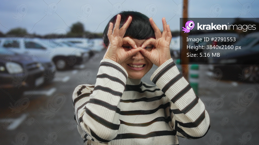Woman playfully making glasses with hands in parking area, with cars and outdoor setting emphasizing fun and youthful energy.