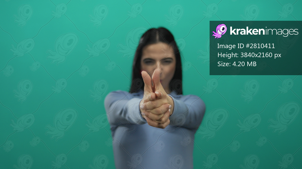 Woman playfully mimicking a gun gesture against a vibrant green background wearing a blue shirt projecting a lively and playful mood.