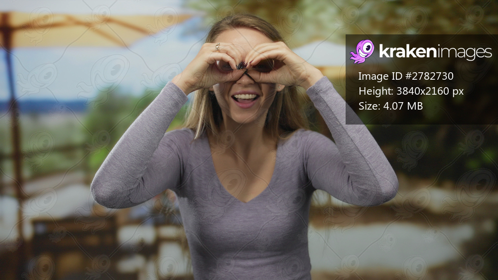Woman playfully mimics binoculars on a sunny terrace of an outdoor coffee restaurant, embodying joy and relaxation in casual style.