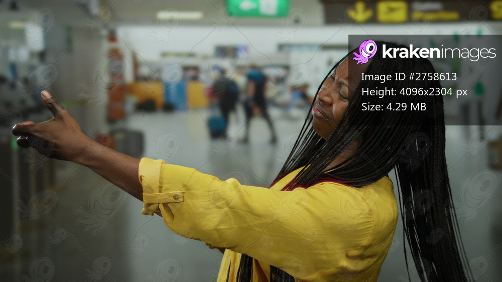 Woman playfully miming rope tension in a bustling airport terminal, showcasing vibrant travel energy with a focus on vibrant indoor environment.