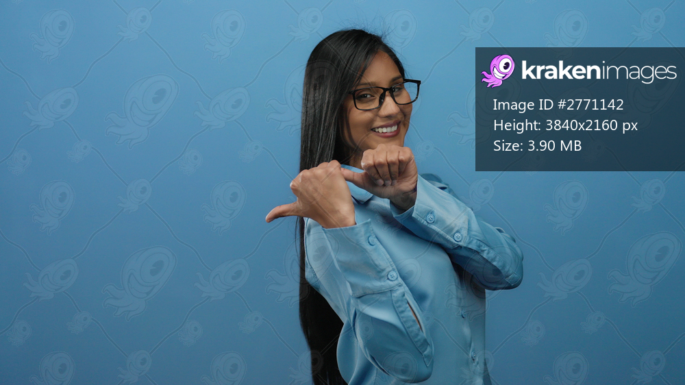 Woman playfully pointing in a stylish blue outfit with isolated blue background showing dynamic expression