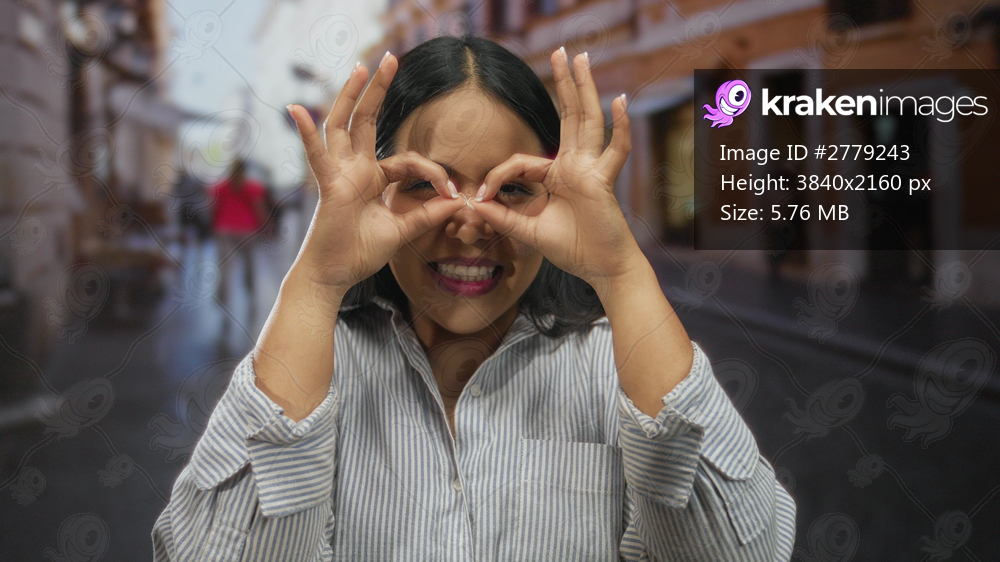 Woman playfully posing outdoors on a vibrant street, capturing the lively essence of urban life with a touch of youthful humor and charm.