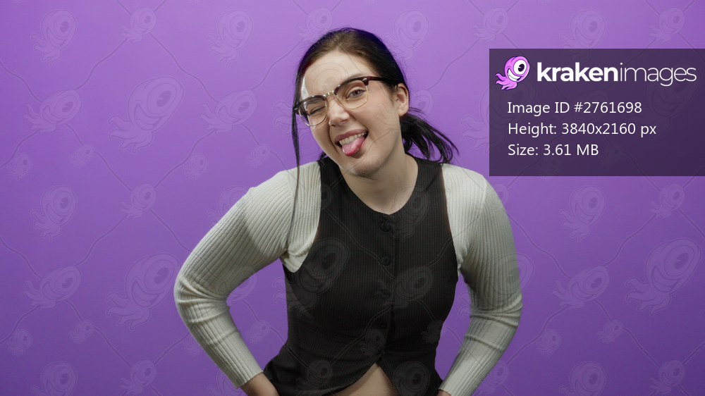 Woman playfully sticking tongue out with glasses against vibrant purple background showcasing playful attitude and casual fashion style with black and white outfit. - Kraken Images